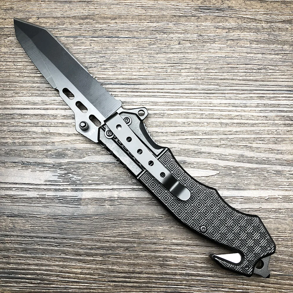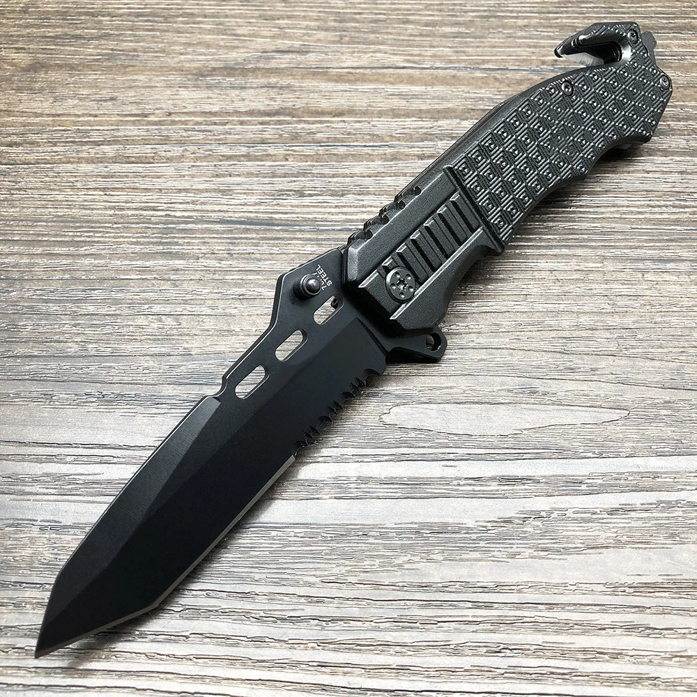 BJL 229 Black Folding Knife 7CR17Mov Half Serrated Blade Tactical Camping Survival Combat Pocket Kn